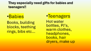 Are you able to donate to the fabulous cause that is Mission Christmas? If so, the donation box is in school’s main reception. This charity works incredibly hard to ensure children in the south don’t go without a gift at Christmas. The two ages that always struggle for gifts are babies and teenagers and here are some ideas.