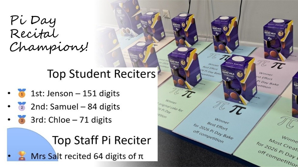 Well done to everyone who took part in our Pi Day celebrations. It was great to see so many creative entries and extraordinary talent on show. Congratulations to our winners for their fantastic work and effort. We look forward to more exciting numeracy events coming soon!